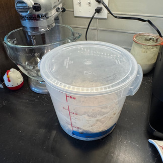 Day 3 you will want to check your starter for activity again. If you have any sign of activity, it's time to "feed your pet". If no activity is apparent, just let it sit for another day. Don't look for dramatic activity at this point, any little bubble or hole counts! Get our your scale. Set the jar on your scale, it had 400 grams of starter in it (200 grams of water and 200 grams of flour gives you 400 grams of starter). You will need to remove 200 grams of starter directly into your trash or compost bin. You will not reuse this beginning discard. One your starter is good and active you will want to use that precious discard. For now, it's not ready to be used for baking. To feed the starter, you will 100 grams of lukewarm water and 100 grams of King Arthur all purpose flour. Mix as outlined above and cover loosely with the glass lid and gasket.I found that using all purpose flour in subsequent feedings results in a more active starter than feeding with whole wheat. It makes a lighter loaf, But we're not ready to start baking yet, just a note to self.